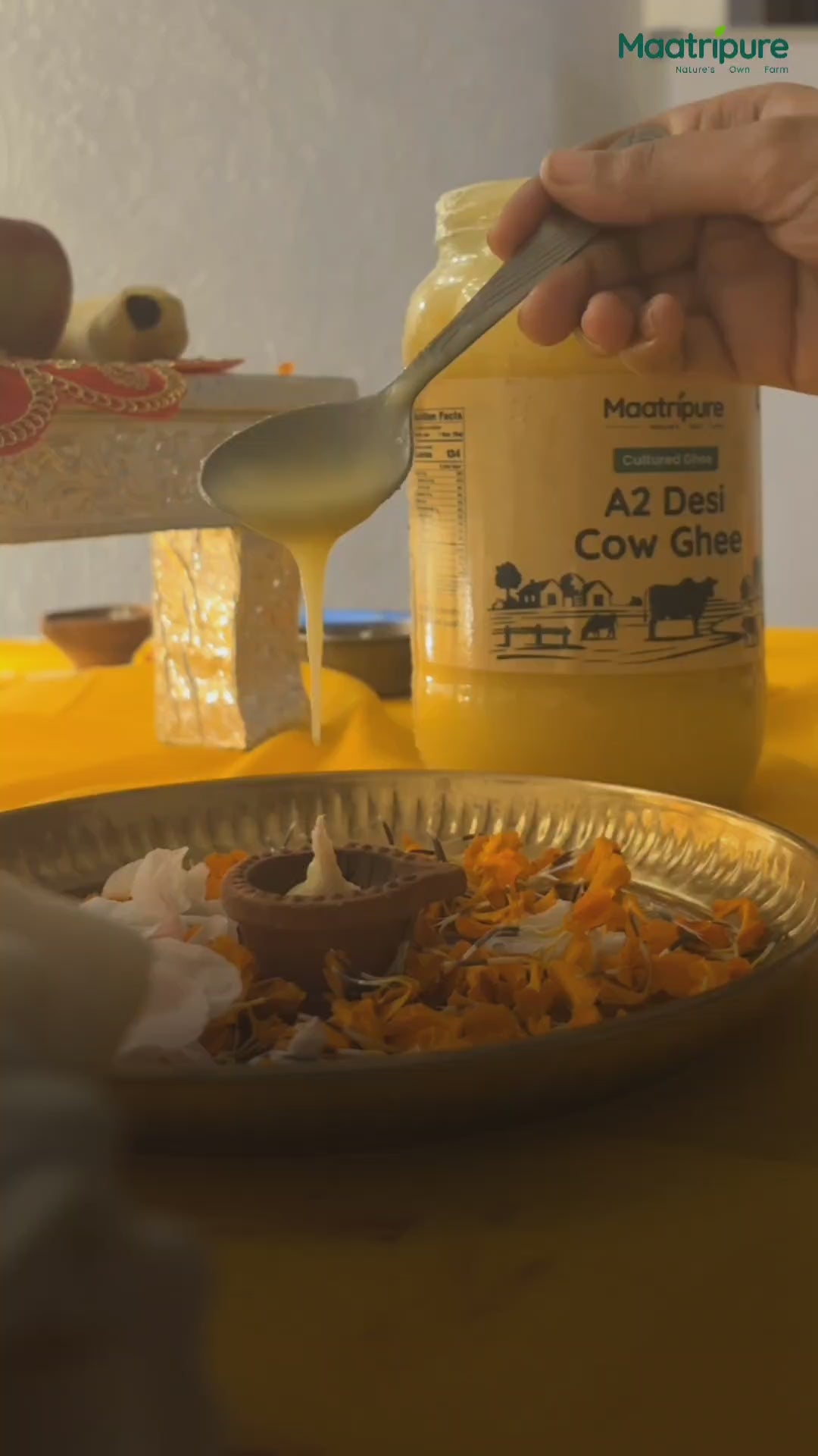 At Maatripure, we craft pure, nutrient-rich A2 Desi Cow Ghee using the time-honored Vedic Bilona method. Our ghee comes from indigenous Desi cows, whose A2-only milk is naturally free of A1 protein and gentle on digestion—almost like mother’s milk. We honor tradition at every step: slow-boiled in earthen pots, naturally fermented curd, hand-churned with care, then gently heated to preserve its radiant golden hue, fragrant aroma, and potent medicinal qualities. Unlike mass-produced varieties, Maatripure stays true to heritage—delivering unmatched purity, buttery taste, and holistic wellness benefits. Brimming with antioxidants, it supports digestion, boosts immunity, and nurtures overall health. Golden, aromatic, and supremely delicious, Maatripure A2 Desi Cow Ghee is your go-to for cooking, Ayurvedic rituals, and daily nourishment. Bring home the purity of tradition. Choose Maatripure—Nature’s Own Farm.